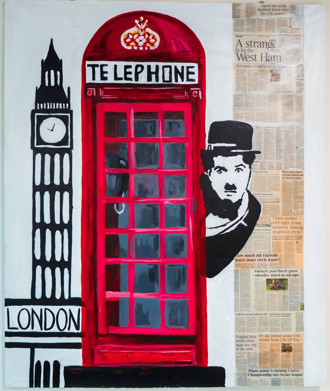 Праворуч від телефонної будки, на фоні колажу з газетних вирізок, зображена постать Чарлі Чапліна – відомого актора та режисера, який довгий час жив у Лондоні. Його силует виконаний у чорно-білій гамі, що створює контраст з яскравою червоною будкою.