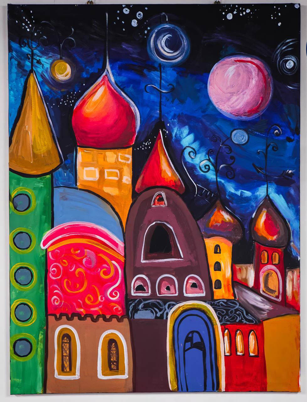 “Місто мрій” – це фантастична картина, що переносить глядача у світ дитячих фантазій та казок. Художники, використовуючи яскраві акрилові фарби, створили сюрреалістичний пейзаж, де химерні будівлі та небесні тіла переплітаються у гармонійній композиції.