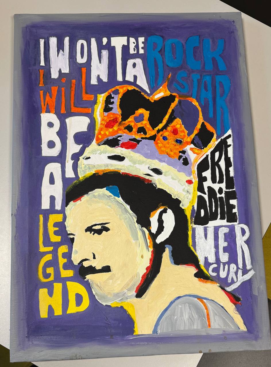 Яскраві кольори, динамічні мазки та контрастні деталі створюють живий образ, який ніби виходить за межі полотна. Фіолетовий фон символізує сценічну магію, золоті акценти на короні підкреслюють його королівський статус у світі музики, а емоційний погляд нагадує про його неймовірний талант та безмежну енергію.