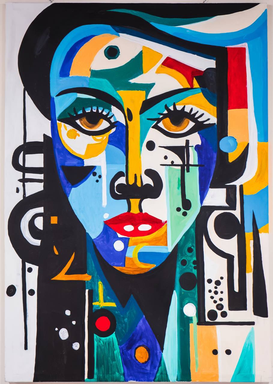 “Портрет у стилі кубізму” – це яскрава та стилізована картина, що зображує портрет людини у незвичайному ракурсі. Художники, використовуючи акрилові фарби, створили динамічну композицію, що поєднує в собі елементи кубізму та сучасного мистецтва.