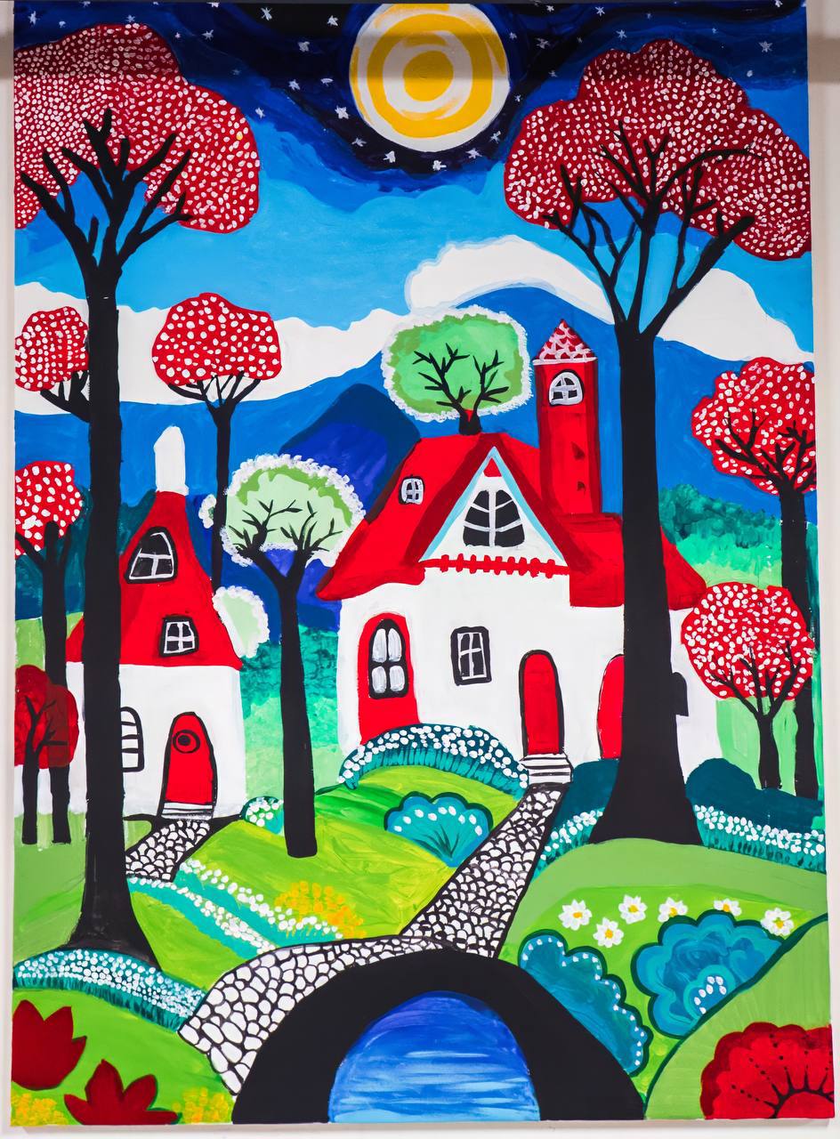 “Казкове село” – це яскрава та фантазійна картина, що зображує мальовниче село, оточене лісом. Художники, використовуючи акрилові фарби, створили сюрреалістичний пейзаж, де реальність переплітається з фантазією.